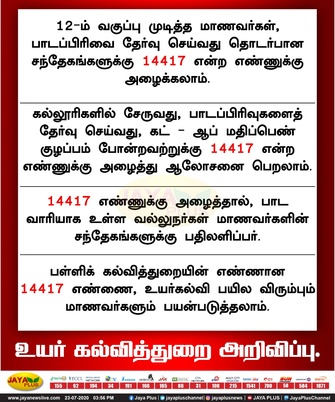 12ஆம் வகுப்பு முடித்த மாணவர்கள், பாடப்பிரிவை தேர்வு செய்வது தொடர்பான சந்தேகங்களுக்கு 14417 என்ற எண்ணுக்கு அழைக்கலாம். - உயர் கல்வித்துறை அறிவிப்பு